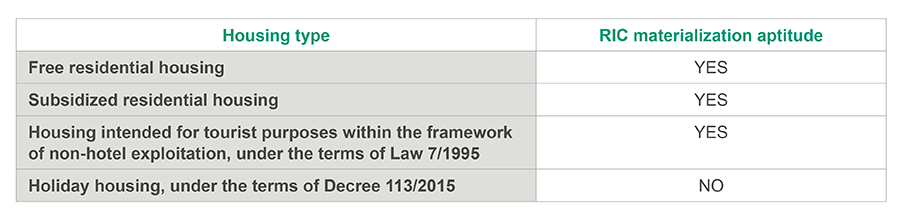 By way of summary, considering the different types of properties, the following types of investment in rental housing can be distinguished and their suitability or not to materialize the RIC: